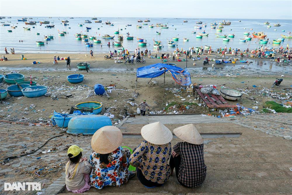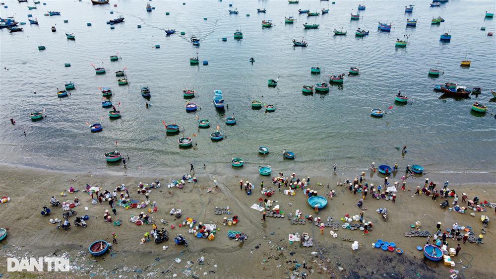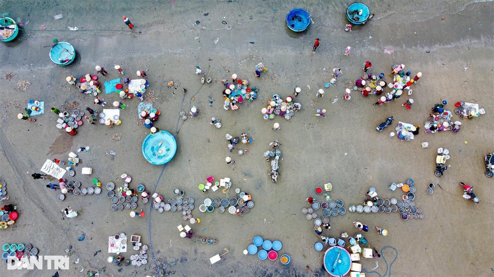 Đây là lúc những đoàn thuyền đánh cá trở về. Tàu thuyền đánh bắt tập kết cách bờ vài chục mét. Thanh niên trai tráng thoăn thoắt chèo thuyền thúng tới lấy và mang những thùng hải sản tươi rói trở về bến.
