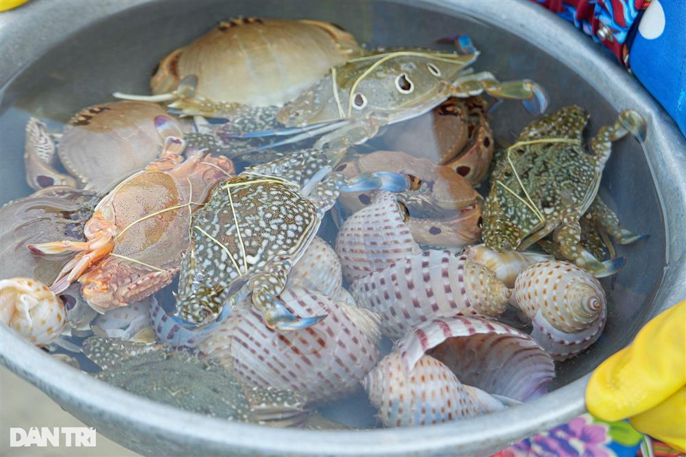 Có những thau hải sản "lẫn", gồm đủ loại như ốc, ghẹ, cua, mực trứng... được bán đồng giá 150.000 đồng/thau.