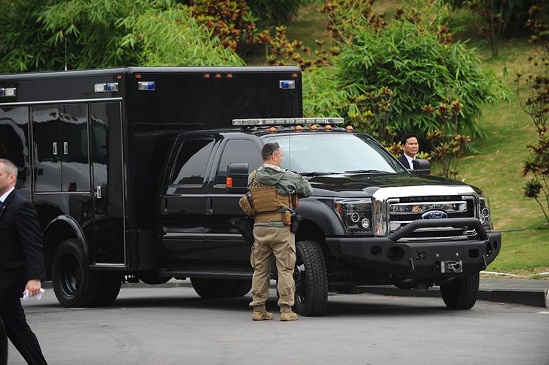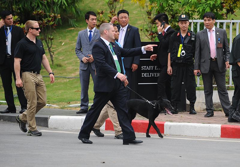 Trong sáng nay, một nhân viên an ninh của Mỹ cùng chú chó thuộc giống Doberman Pinscher, đã thực hiện nhiệm vụ bảo đảm an ninh nghiêm ngặt. Chú chó này có dáng nhỏ, đuôi gần như bị cụt, lông đen tuyền, tai vểnh, mắt sáng trông rất khôn. Sau khi chạy vòng quanh các xe ô tô hít ngửi, rồi lại sục sạo ở dưới gầm xe, thậm chí lao cả lên xe để phát hiện những dấu hiệu khả nghi. Chỉ sau khi chú chó này làm xong công việc của mình, thì những chiếc xe ô tô mới được phép ra vào cổng an ninh khách sạn.