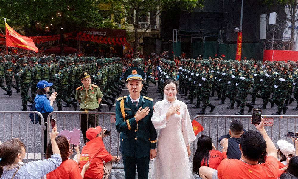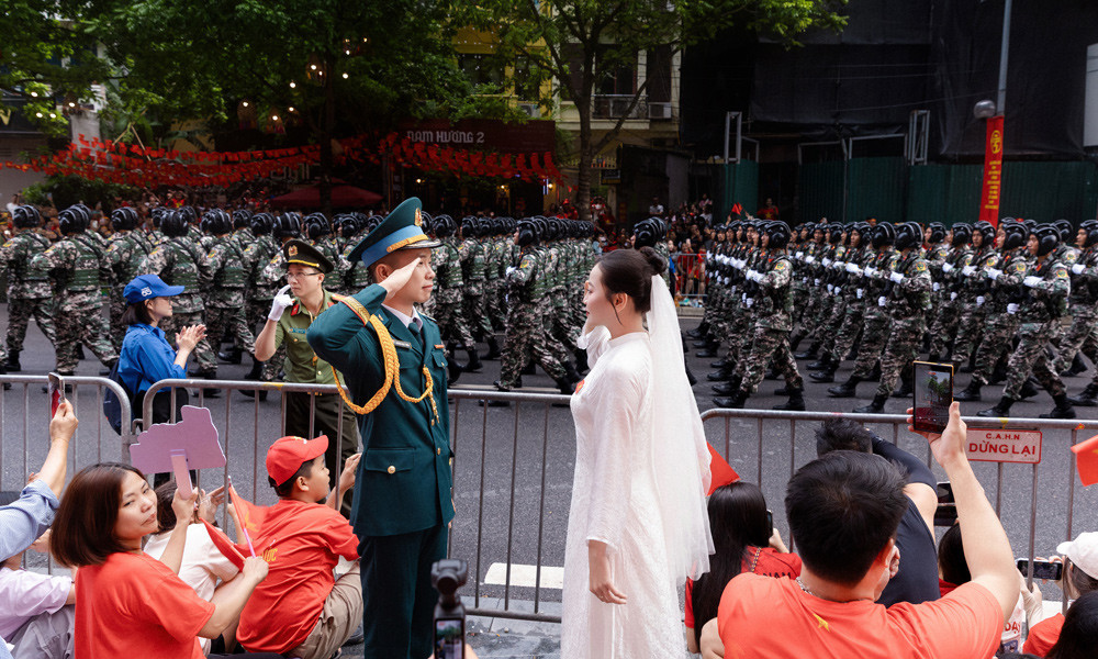 Sáng 30/8, trời tạnh ráo. Vinh mặc quân phục, Ngân khoác áo dài trắng. Không cần tạo dáng cầu kỳ, họ vẫn có được những bức ảnh đặc biệt bởi xung quanh là hàng ngũ chiến sĩ diễu binh và sắc đỏ rực rỡ của quốc kỳ.