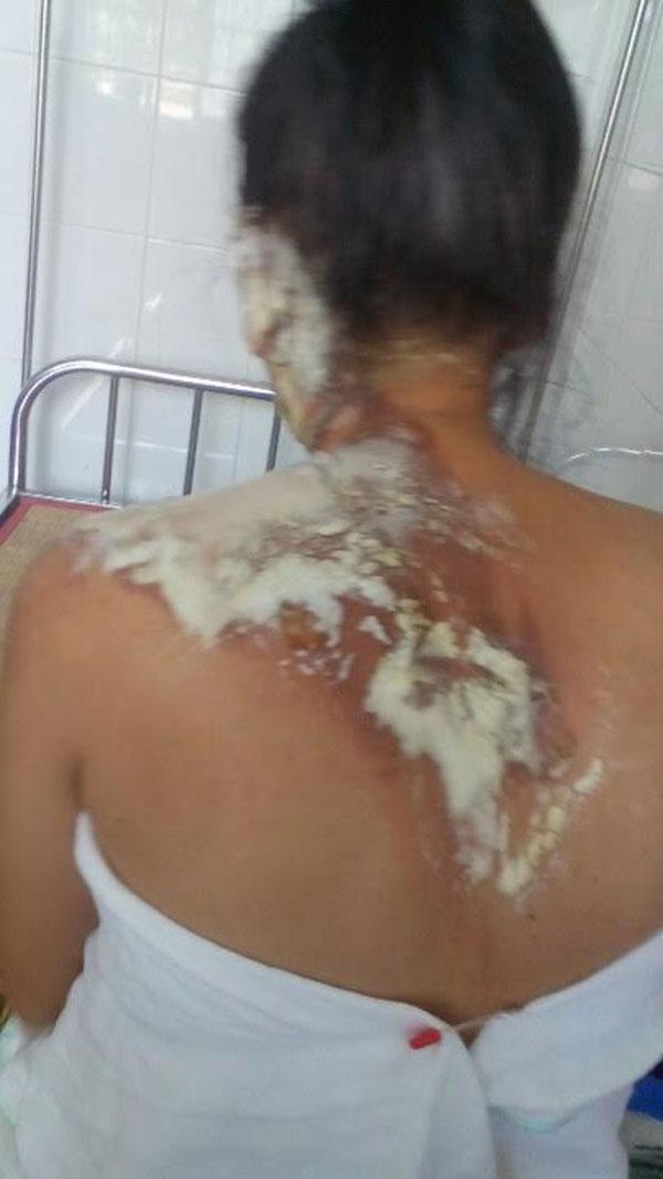 Bà Lệ bị phỏng nặng do chồng bạo hành bằng nước sôi.