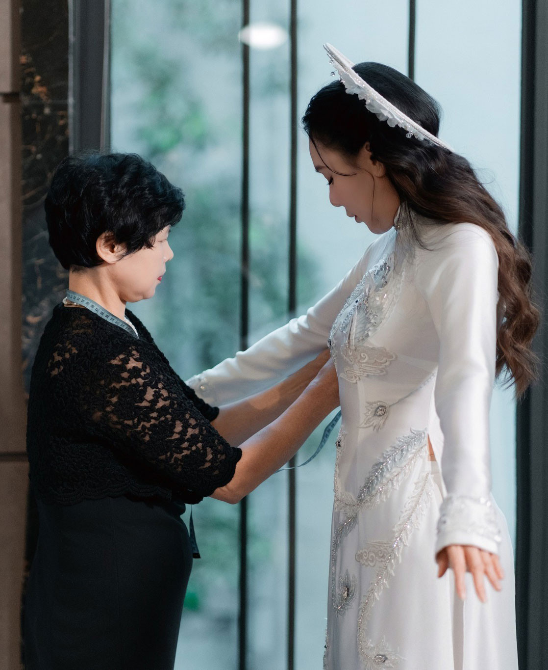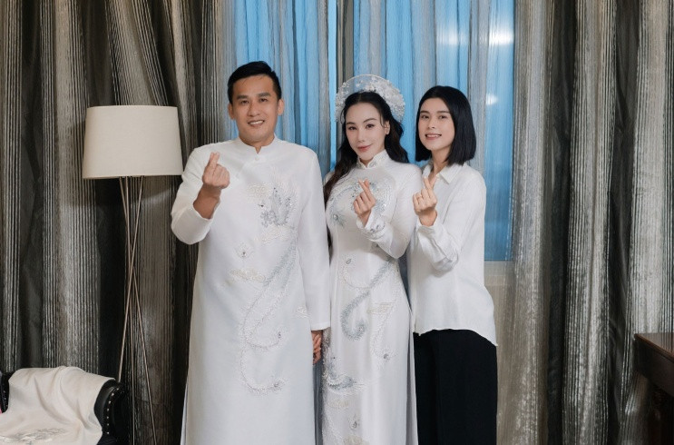 Theo đó, chồng doanh nhân của Hồ Quỳnh Hương sở hữu ngoại hình cao ráo, khá xứng đôi với cô dâu. Trong hình, cả hai lựa chọn áo dài trắng đồng điệu. Bộ áo dài của cặp uyên ương có tên "Bạch song phụng" - biểu tượng của sự gắn bó và viên mãn trọn đời.