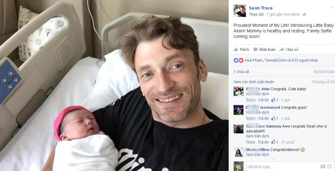 Mới đây nhất, trên trang cá nhân của mình chồng Phương Vy đăng tải và để ảnh đại diện chụp cùng công chúa nhỏ nhận được nhiều lời chúc mừng của người thân và bạn bè. Sean Trace viết: "Proudest Moment of My Life! Introducing Little Baby Ailani! Mommy is healthy and resting. Family Selfie coming soon! ( Tạm dịch: "Khoảnh khắc tự hào nhất trong cuộc đời của tôi! Xin giới thiệu bé tên là Ailani. Mẹ bé đã khỏe và đang nghỉ ngơi. Ảnh tự sướng sớm nhất đây.")