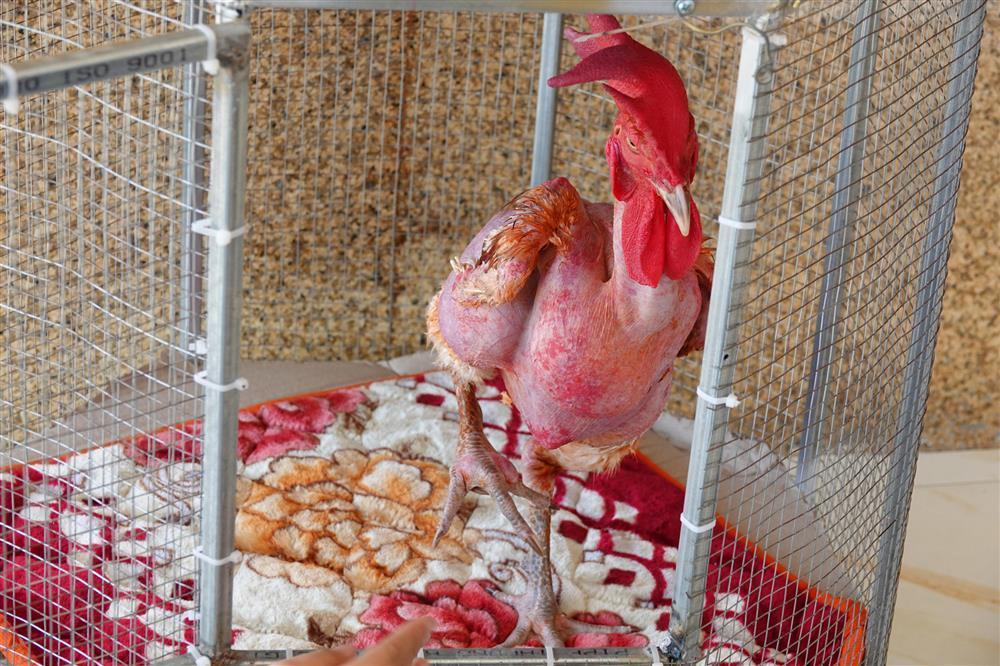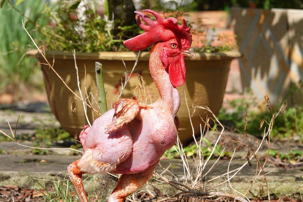 Chú gà không lông này có mào rất dày, thân đỏ rực. Do nó gần như "khỏa thân" nên rất nhạy cảm với thời tiết. Chủ nhân phải chăm sóc kỹ lưỡng từ ngày mới nở, cho đến giờ đã gần 2 năm.