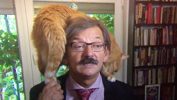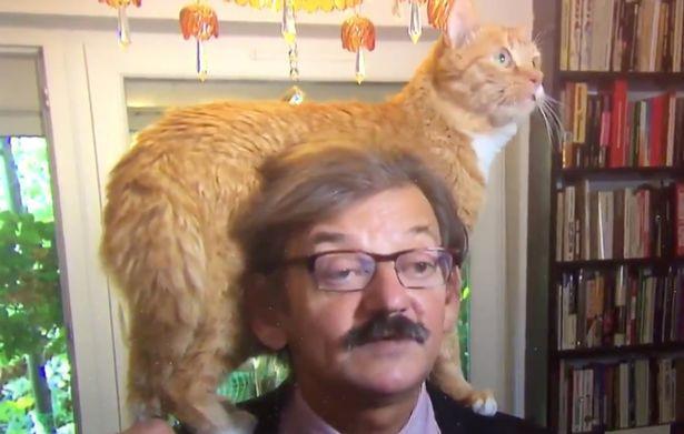 Nhiều người cảm thấy thú vị khi chú mèo vàng to béo chễm chệ trên vai của tiến sĩ ngay trên sóng truyền hình trực tiếp mà không bị chủ nhân đuổi xuống.