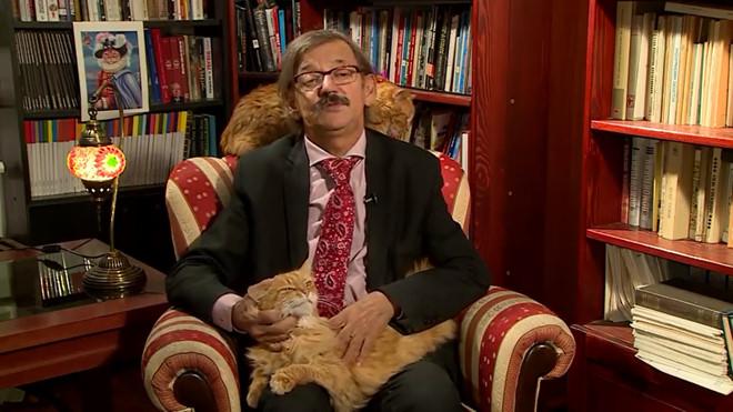 Ông tiếp tục nói về các vấn đề chính trị một cách hết sức điềm tĩnh, phân tích, đưa ra các quan điểm một cách rõ ràng như không hề để ý đến con mèo trên vai. Ánh mắt, vẻ bình thản cho thấy ông đã quá quen với sự quấy rối của con mèo.