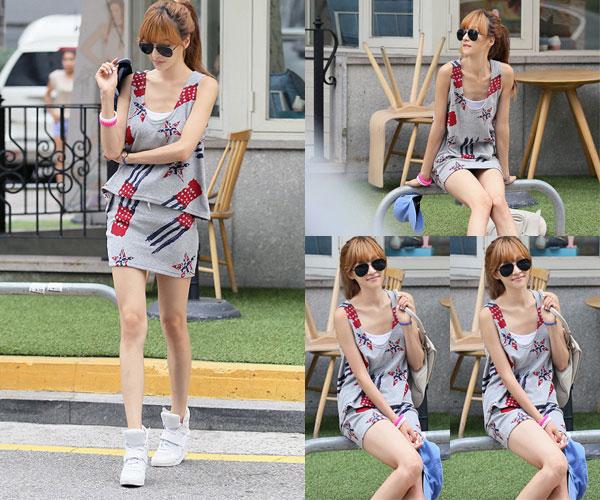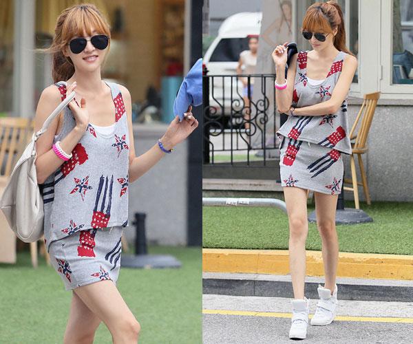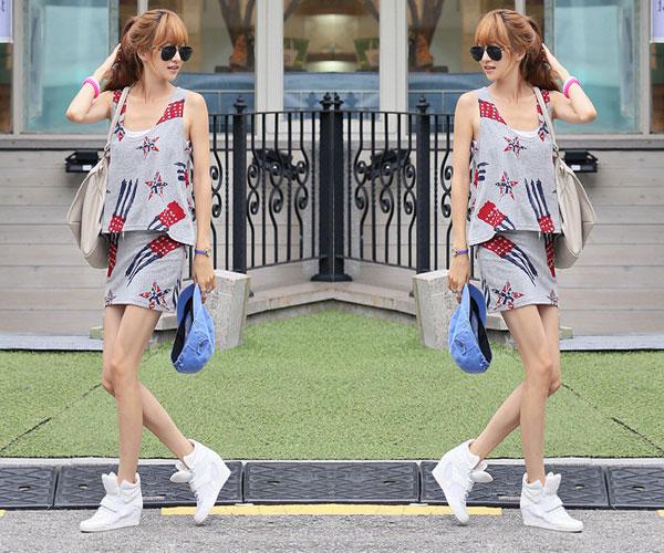 Trang phục thể thao không kém phần sành điệu là thiết kế áo ba lỗ, quần short ngắn cùng áo khoác mỏng bên ngoài.
