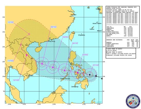 Trong 24 giờ tới, bão di chuyển nhanh theo hướng giữa Tây và Tây Tây Bắc, mỗi giờ đi được khoảng 35km. Như vậy, khoảng chiều tối nay 8/11, bão sẽ đi vào biển Đông.