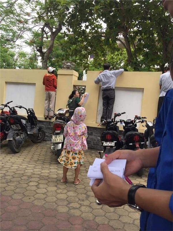 Ở một góc khác của kỳ thi, những bậc phụ huynh đứng ngồi không yên bên ngoài cổng trường, một số cô chú còn đứng hẳn lên bậc tường để nhìn vào trong sân, mong ngóng con mình từng phút một.