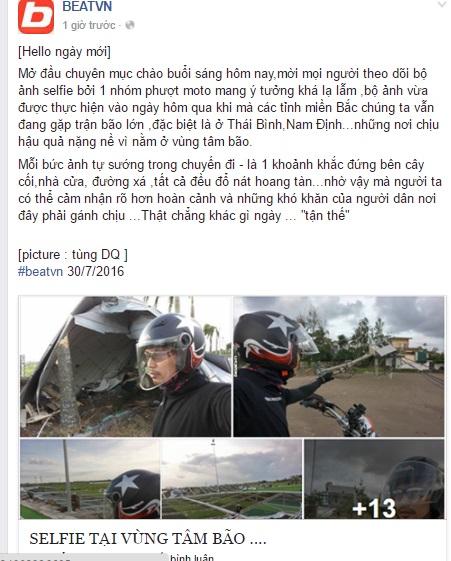 Chia sẻ từ Beatvn: "Mở đầu chuyên mục chào buổi sáng hôm nay, mời mọi người theo dõi bộ ảnh selfie bởi 1 nhóm phượt moto mang ý tưởng khá lạ lẫm, bộ ảnh vừa được thực hiện vào ngày hôm qua khi mà các tỉnh miền Bắc chúng ta vẫn đang gặp trận bão lớn, đặc biệt là ở Thái Bình, Nam Định...những nơi chịu hậu quả nặng nề vì nằm ở vùng tâm bão.