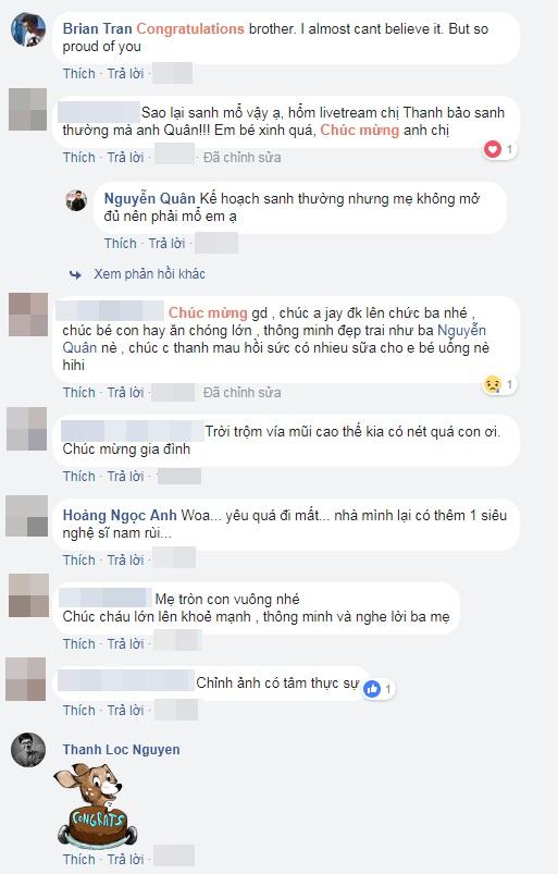 Phía dưới bình luận, rất đông cư dân mạng đã gửi lời chúc mừng đến nam diễn viên và bà xã Chúng Huyền Thanh đã sinh được cậu con trai kháu khỉnh.
