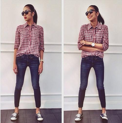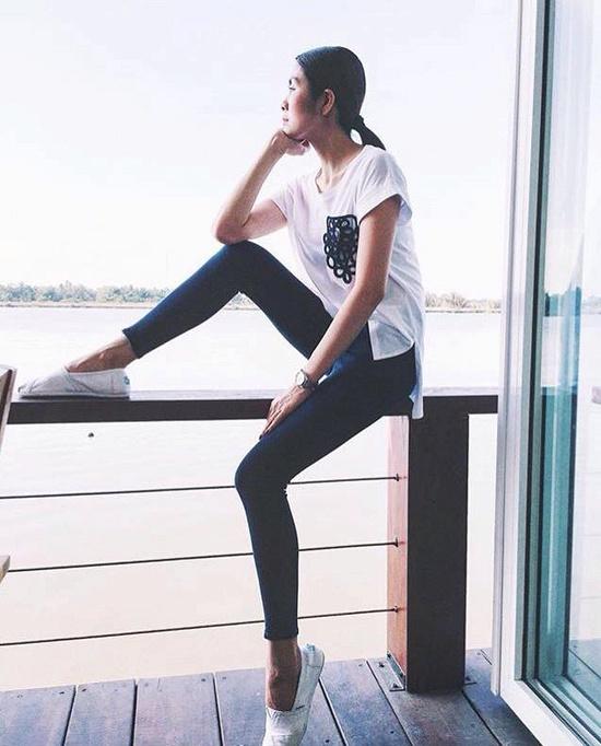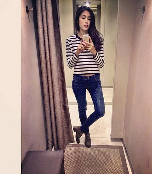 Tăng Thanh Hà để lộ thân hình gầy đen, đặc biệt là khi cô mặc chiếc quần skinny ôm sát kết hợp với áo phông, sơ mi...