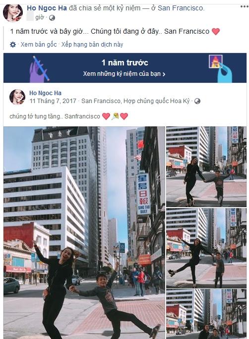 Cùng với bức ảnh bên con trai, giọng ca Gửi người yêu cũ đồng thời chia sẻ lại kỷ niệm của "ngày này năm trước". Dẫn lại loạt hình hai mẹ con check-in tại San Francisco vào ngày 11/7 hồi năm ngoái, Hà Hồ viết: "1 năm trước và bây giờ... Chúng tôi đang ở đây. San Francisco".