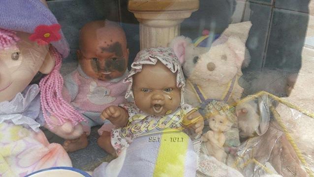 Con búp bê lấm bẩn ngay bên cạnh búp bê khóc được cho là dùng ánh mắt nhìn xua đuổi mọi người bước vào ngôi mộ. (Ảnh: Daily Star).