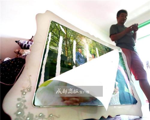 Phát hiện hình bị quăn ở mép anh đã mang xuống dán lại và "tá hỏa". (Ảnh: chengdu)