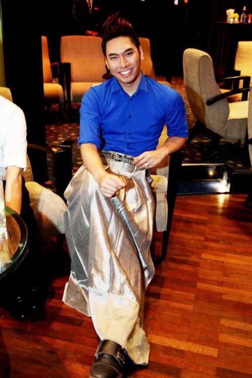 Lý Quí Khánh hài hước khi diện set đồ sơ mi mix chân váy midi ánh bạc nổi bật. Bộ cánh này khiến anh chàng lọt top sao mặc thảm họa.