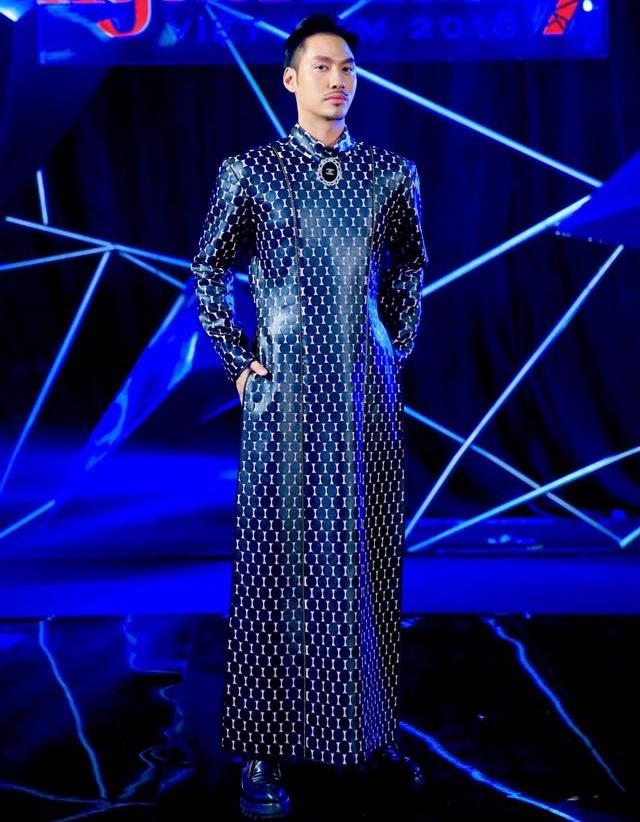 Lý Quí Khánh chơi trội với áo dài họa tiết tối màu trên ghế giám khảo chương trình "Người mẫu Việt Nam".