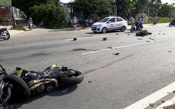 Vào khoảng 15h chiều 2.7, xe mô tô phân khối lớn BKS: 60A1-005.13 lưu thông trên đường Mỹ Phước - Tân Vạn hướng từ Bình Dương đi Đồng Nai, khi đến đoạn thuộc khu phố 1A (phường An Phú, thị xã Thuận An, tỉnh Bình Dương) thì đối đầu cực mạnh với xe máy “kẹp” 3 chạy ngược chiều.