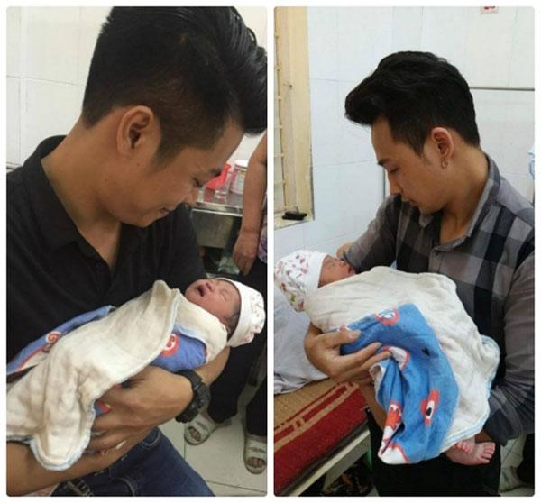 Nguyễn Thành Nam (bên trái) đang ẵm em bé do chính tay mình đỡ đẻ phụ.