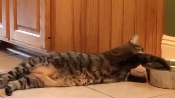Nếu đã từng trải qua cảm giác cực kì lười biếng đến mức làm gì cũng ngại, hẳn là bạn sẽ đồng cảm với chú mèo trong đoạn clip này. Đáng lẽ chỉ thêm một cái vươn người nữa là có thể vục đầu vào chiếc bát uống nước thỏa thuê, chú mèo siêu lười đã chọn cách… nằm im và thò chân vào bát để múc nước ra uống. Hình ảnh cực đáng yêu và ngộ nghĩnh của chú hiện đã thu hút hơn 20 triệu lượt xem trên Facebook.