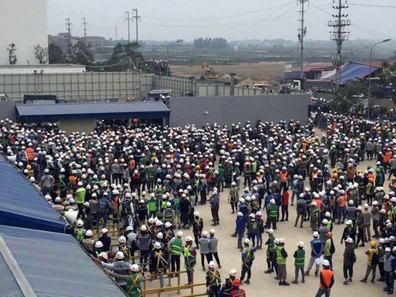 Nhóm công nhân tụ tập ngay tại cổng vào của nhà máy Samsung Display Việt Nam