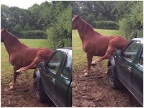 Vụ việc xảy ra tại West Clandon, Anh. Chú ngựa ngồi với tư thế rất hài hước với toàn bộ mông trên nắp chiếc ô tô, trong khi một chân giơ lên khỏi mặt đất và bắt đầu... gãi ngứa.