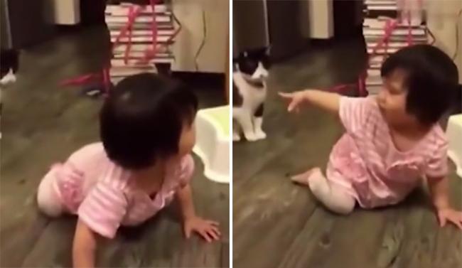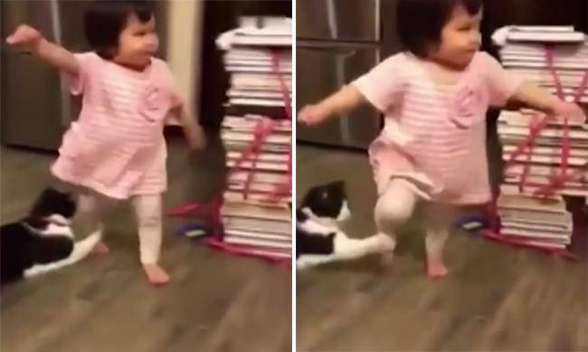 Khi bé gái chạy ngang qua trước mặt con mèo trắng đen, nó lập tức thò chân trước ra để ngáng. Vì bước đi của cô bé chưa được vững, nên đã vấp ngã ngay sau đó.
