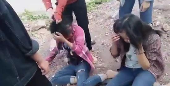 Hai cô gái tội nghiệp liên tiếp bị nhóm thiếu niên dùng chân đạp vào người (Ảnh cắt từ clip)