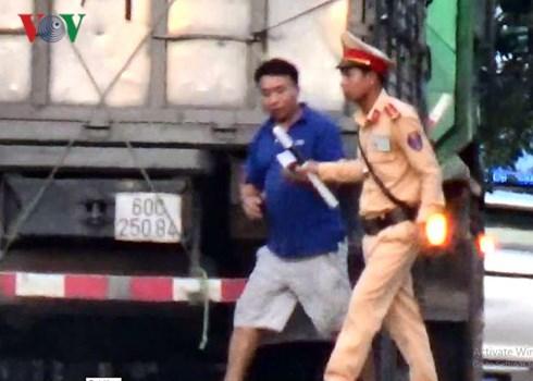 Người cảnh sát chuyển tay cầm gậy, dúi vật tóm được từ trong xấp giấy của tài xế vào bụng áo cảnh phục.