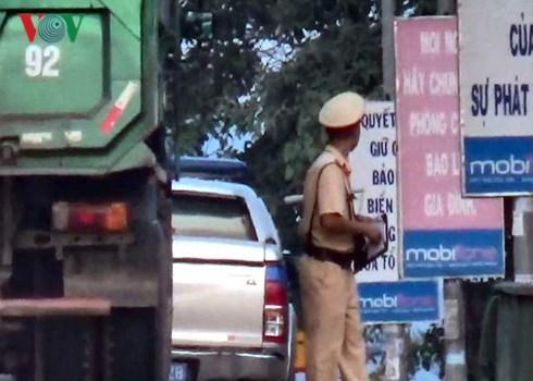 Trong khi đó, người cảnh sát cầm gậy lại tiếp tục đón lấy một cuốn sổ của tài xế xe tải (áo thu xanh xậm) vừa dừng sau xe ben. Người cảnh sát chỉ hé cuốn sổ ra nhìn sơ qua, rồi vừa đi vừa ngước mắt lên thùng xe tải, trong khi tay vân vê cuốn sổ. Sau khi lấy được “cái gì đó” kẹp trong cuốn sổ, anh này liền ngửa cuốn sổ ra, không cần đọc, trả lại ngay cho tài xế xe tải. Xe khách và xe tải được phép rời đi.