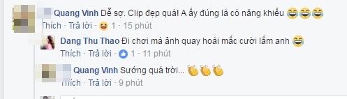 Không chỉ hết lời khen Hoa hậu, thiếu gia Quang Vinh còn dành lời có cánh cho người đàn ông mà Thu Thảo lựa chọn. "Clip đẹp quá, anh ấy đúng là có năng khiếu... Em sướng quá trời". Đáp lại lời Quang Vinh, Miss Vietnam 2014 hào hứng khoe: "Đi chơi mà ảnh quay hoài. Mắc cười lắm anh ạ".