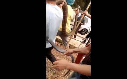 Dù không trực tiếp chứng kiến cảnh người dân bắt rắn hổ mang thế nhưng theo dõi qua đoạn clip cũng đủ khiến nhiều dân mạng rùng mình. Trong đoạn clip, khi phát hiện thấy có con rắn hổ mang khủng bò giữa đường, một nhóm người đã tập trung lại và hô hào nhau tìm cách bắt.