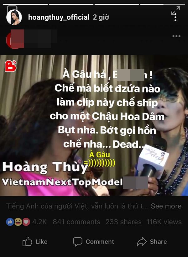 "À Gâu hả! Chế mà biết đứa nào làm clip này, chế ship cho một chậu hoa dâm bụt nha. Bớt gọi hồn chế nha... Dead", chân dài họ Hoàng hài hước cảnh cáo.