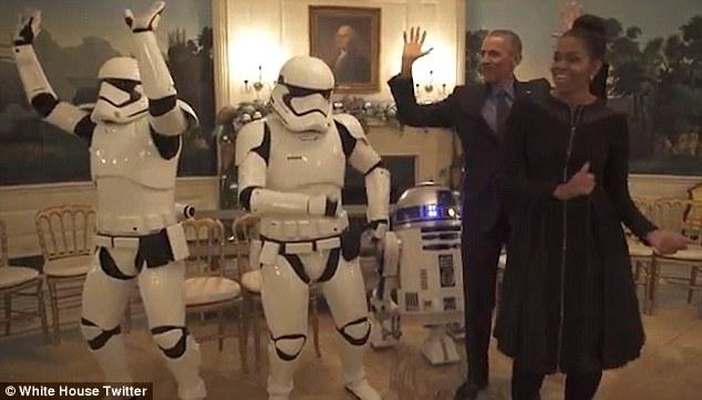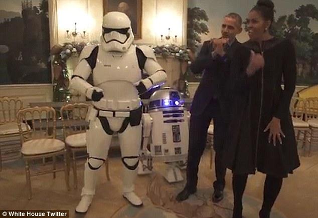 Ngày 4 tháng 5 được nhớ đến qua câu nói nổi tiếng" May the 4th be with you" trong bộ phim " Star Wars. Ngoài vợ chồng tổng thống Obama còn có sự tham dự của robot R2-D2 cùng bộ đôi " Stormtrooper"