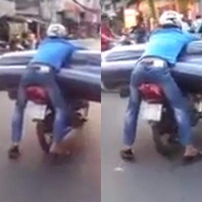 Người này đang nhoài người hết cỡ điều khiển chiếc xe máy lưu thông trên đường.