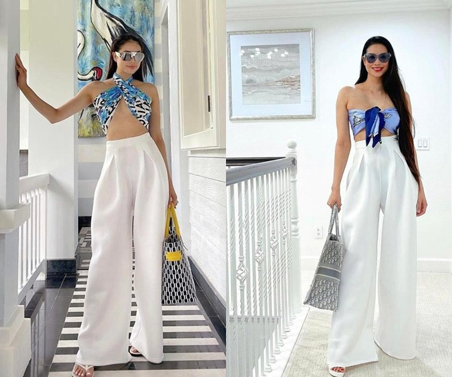 2 lần diện mốt quấn khăn làm áo, Phạm Hương đều tận dụng chiếc quần trắng lưng cao quen thuộc để phối cùng.