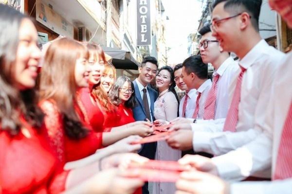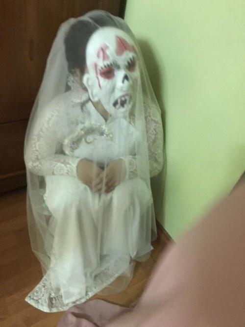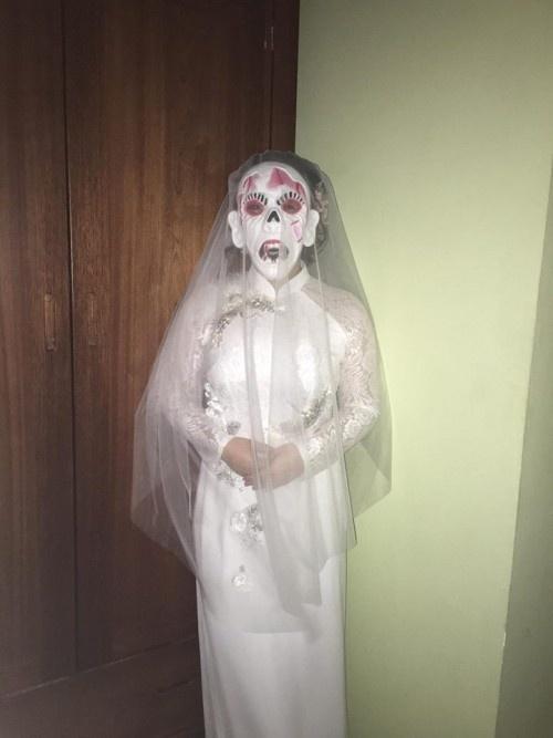 Theo đó, cô dâu mặc áo dài trắng, đeo khăn voan dịu dàng như ai, nhưng cái mặt nạ quỷ xấu xí chiếm trọn mặt tiền.