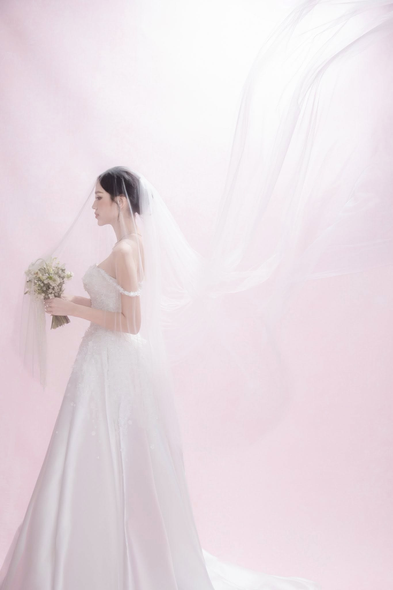 Ngoài ra, cả hai còn thực hiện một bộ ảnh tại studio. Khoác trên mình thiết kế váy cưới màu trắng của NTK Lê Thanh Hòa, cô dâu Đỗ Thị Hà được khen visual và vóc dáng sáng bừng.