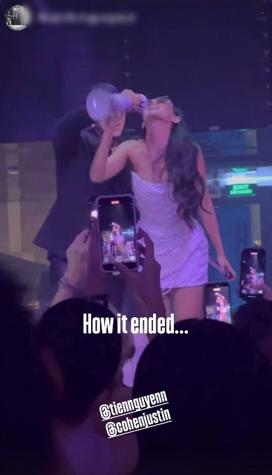 Cô dâu Tiên Nguyễn thay một bộ váy màu trắng phom ngắn, quẩy hết mình cùng chú rể và bạn bè thân thiết. Chú rẻ cũng thay bộ suit đen thoải mái hơn. Cặp đôi không ngại trao nhau nụ hôn tình tứ trước quan khách.