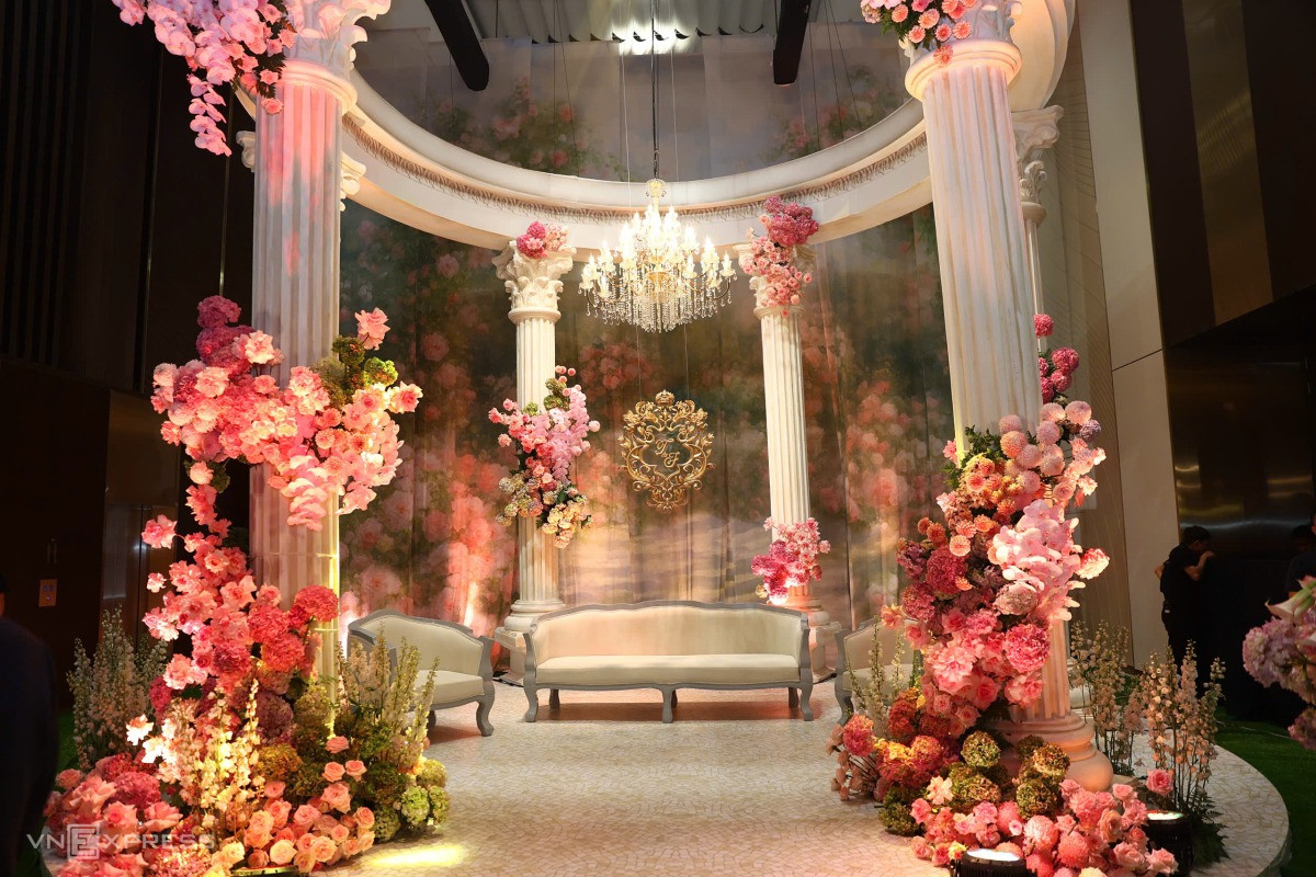 Hôn lễ cặp đôi được trang trí như khu vườn địa đàng lấy ý tưởng từ kiến trúc Phục Hưng. Đây là phong cách có từ thế kỷ 14 đến 17 ở châu Âu, hồi sinh các giá trị của Hy Lạp và La Mã cổ đại, nhấn mạnh tính đối xứng, tỷ lệ, hình học và sự hài hòa, sử dụng các yếu tố như cột, vòm bán nguyệt, mái vòm...