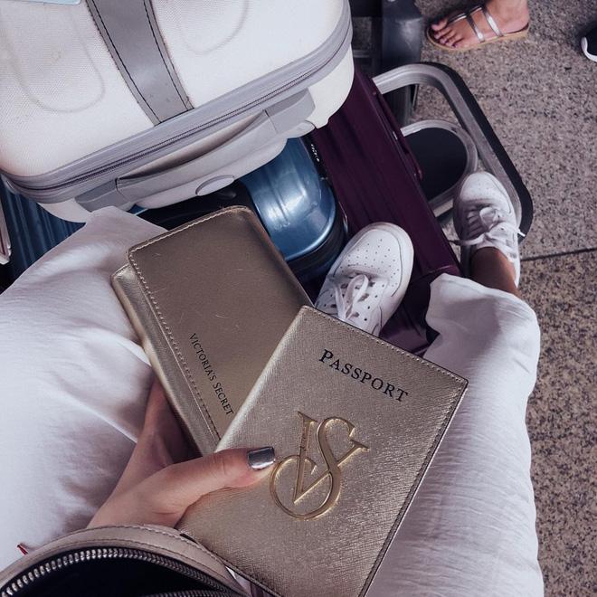 Ví với passport "tông xuyệt tông" màu vàng của Victoria's Secret và lấp ló xa xa là giày Nike Air Force 1 All White