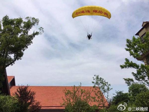 Si tình và điên rồ không kém là chàng trai ở Nghi Xương, Hồ Bắc. Anh này dự định sẽ nhảy dù từ trên trời xuống trước mặt bạn gái, quỳ gối dưới chân cô và cầu hôn.