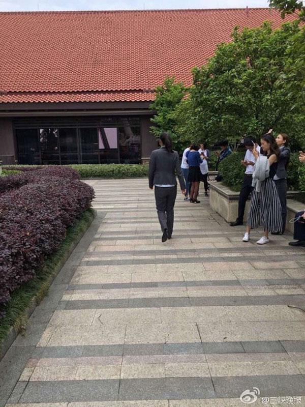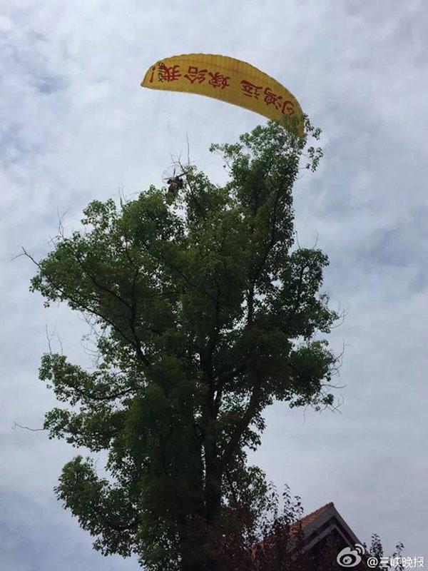 Tuy nhiên, trời không chiều lòng người, một cơn gió mạnh đã đẩy anh chàng cùng chiếc dù với dòng chữ "Gou Hongyun, cưới anh đi" mắc vào một cây cao.