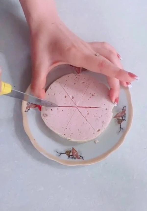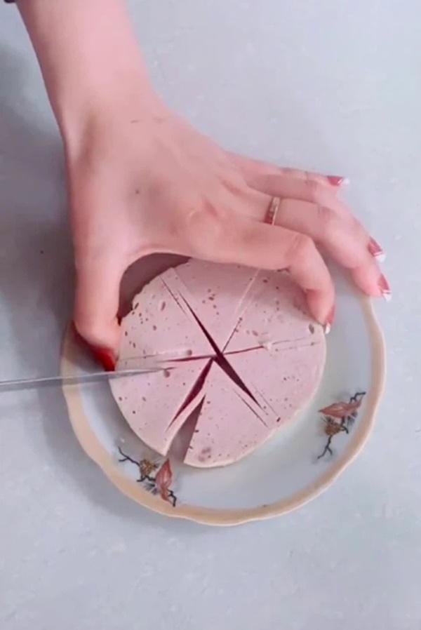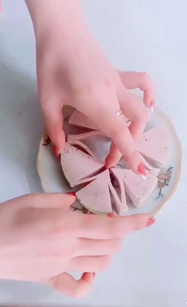 Theo đó, thay vì cắt miếng giò chả thành hình múi cau quen thuộc, cô gái lại sử dụng cách khác để biến phần ăn thành hình bông hoa cực đẹp mắt. Với 3 nhát cắt đầu tiên, chúng ta phải làm sao chia miếng giò thành 6 phần bằng nhau nhưng vẫn không khiến chúng bị tách ra. Sau đó, chỉ cần thêm 2 nhát cắt xen kẽ ở hai bên nhát cắt ban đầu là ta đã có thành phẩm như mong muốn.