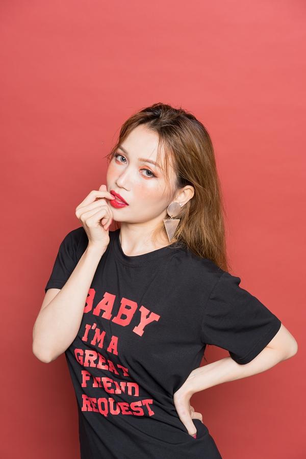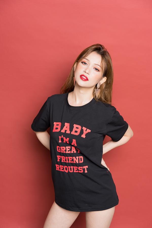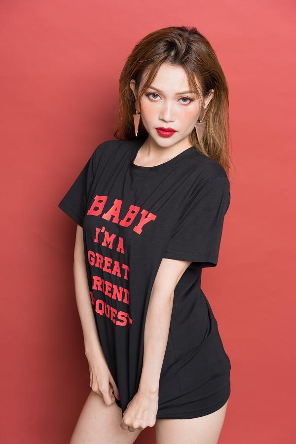 Sĩ Thanh gợi cảm từng centimet trong chiếc áo phông dài với câu sologan cá tính, diện theo mốt giấu quần.