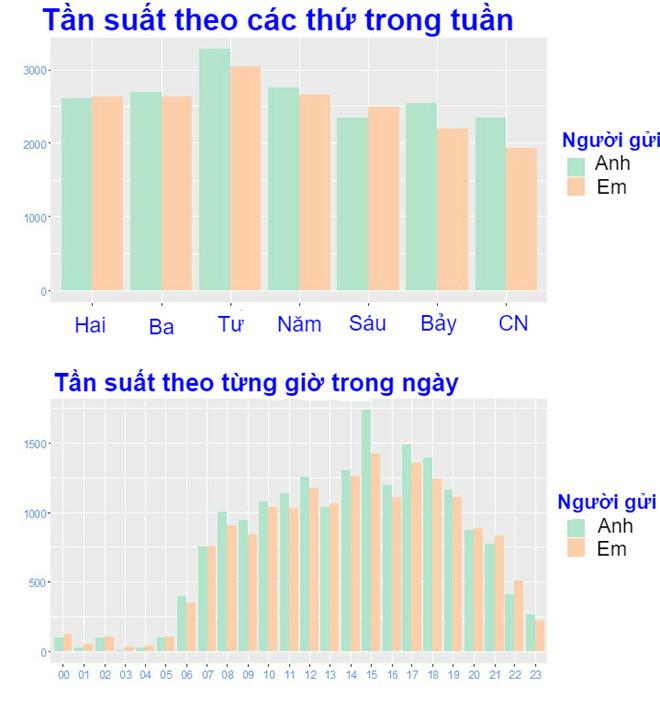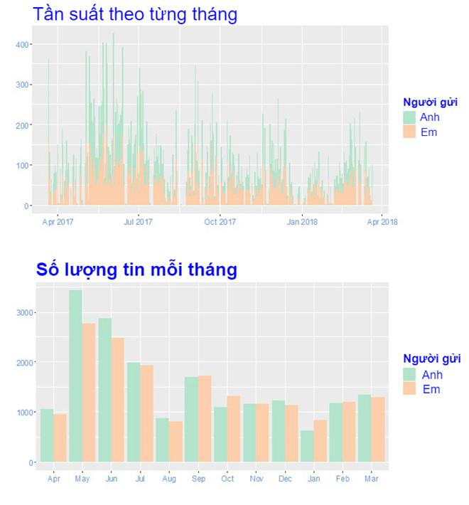 Không chỉ là đếm số lượng tin nhắn, cô nàng còn thống kê chi tiết số lượng, tần suất nhắn tin mỗi tháng, mỗi ngày, mỗi giờ. Sumisel còn có tâm đến mức lập biểu đồ cho cả những từ ngữ, biểu tượng emoji mà hai người thích dùng nhất.