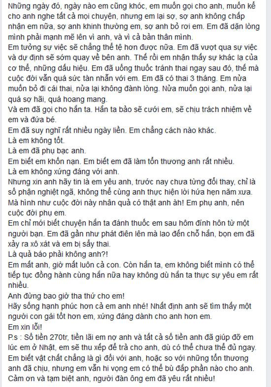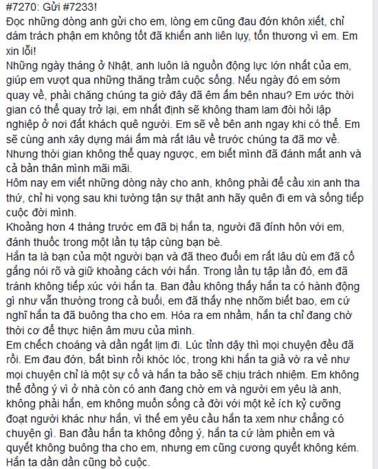 Trích dẫn tâm thư của cô gái: "Đọc những dòng anh gửi cho em, lòng em cũng đau đớn khôn xiết, chỉ dám trách phận em không tốt đã khiến anh liên lụy, tổn thương vì em. Em xin lỗi!