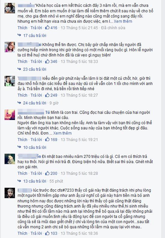 Sau khi cho biết mình cũng vô cùng đau khổ khi kết thúc mối tình 8 năm để phải kết hôn với kẻ đã hãm hại mình, cô gái cũng nhận được những lời động viên, thông cảm. Tuy nhiên, bên cạnh đó nhiều ý kiến cho rằng những gì cô nói chỉ là ngụy biện mà thôi.