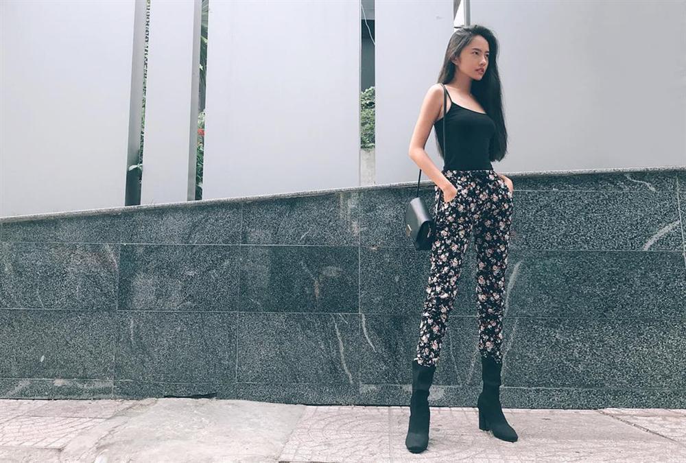 Váy hai dây có lẽ là item quen thuộc nhất với thí sinh Việt Nam của ANTM, khi nó xuất hiện xuyên suốt cùng cô từ sự kiện, đường phố cho đến trong các bộ ảnh thời trang. Lần này, người đẹp sinh năm 1995 chọn kết hợp cùng quần hoa và boots cao hầm hố, cân bằng lại sự đơn điệu của áo hai dây cơ bản.