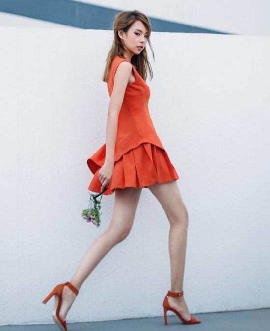 Bộ cánh màu cam được Phí Phương Anh kết hợp đồng điệu cùng đôi xăng đan cao gót. Cô tự tin khoe đôi chân thon dài, sải bước trên đường phố.